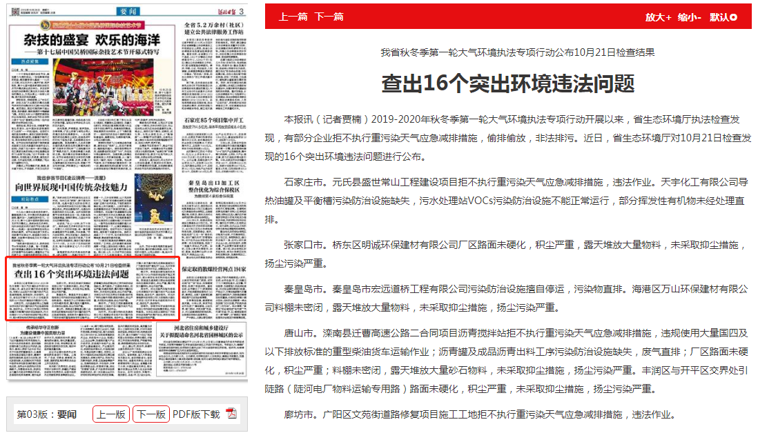 石家庄市。元氏县盛世常山工程建设项目拒不执行重污染天气应急减排措施,违法作业。天宇化工有限公司导热油罐及平衡槽污染防治设施缺失,污水处理站VOCs污染防治设施不能正常运行,部分挥发性有机物未经处理直排。
