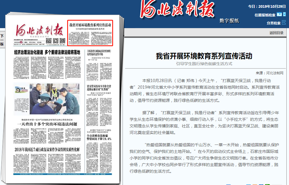 河北法制报:我省开展环境教育系列宣传活动 引导学生践行绿色低碳生活方式