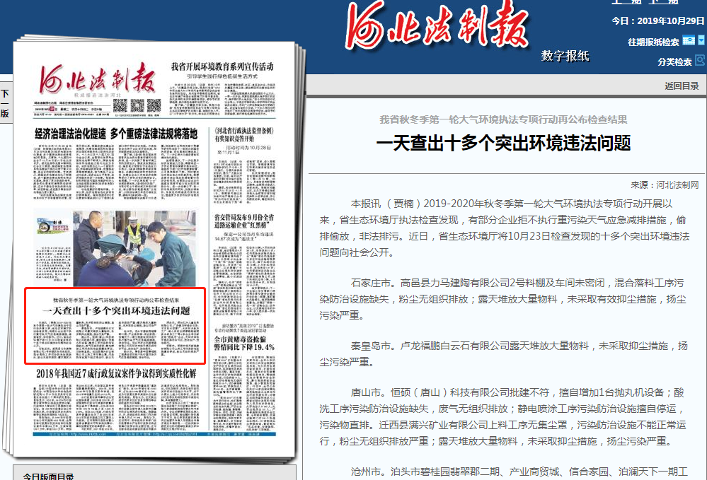 唐山市。恒硕(唐山)科技有限公司批建不符,擅自增加1台抛丸机设备;酸洗工序污染防治设施缺失,废气无组织排放;静电喷涂工序污染防治设施擅自停运,污染物直排。迁西县满兴矿业有限公司上料工序无集尘罩,污染防治设施不能正常运行,粉尘无组织排放严重;露天堆放大量物料,未采取抑尘措施,扬尘污染严重。
