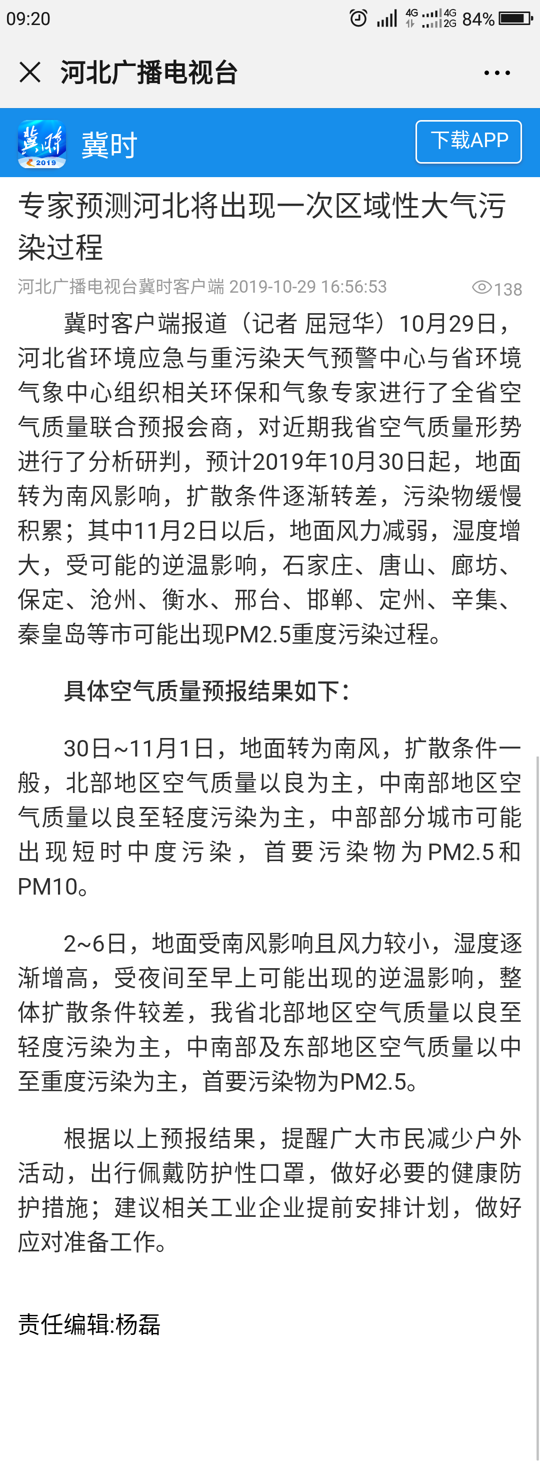 河北广播电视台冀时客户端:专家预测河北将出现一次区域性大气污染过程