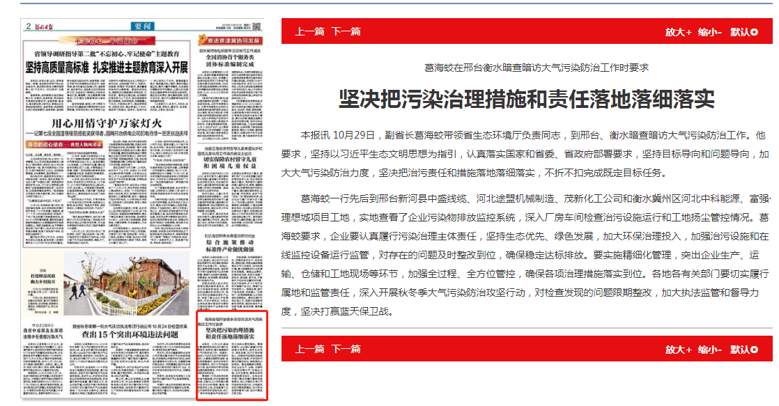 葛海蛟一行先后到邢台新河县中盛线缆、河北途盟机械制造、茂新化工公司和衡水冀州区河北中科能源、富强·理想城项目工地,实地查看了企业污染物排放监控系统,深入厂房车间检查治污设施运行和工地扬尘管控情况。葛海蛟要求,企业要认真履行污染治理主体责任,坚持生态优先、绿色发展,加大环保治理投入,加强治污设施和在线监控设备运行监管,对存在的问题及时整改到位,确保稳定达标排放。要实施精细化管理,突出企业生产、运输、仓储和工地现场等环节,加强全过程、全方位管控,确保各项治理措施落实到位。各地各有关部门要切实履行属地和监管责任,深入开展秋冬季大气污染防治攻坚行动,对检查发现的问题限期整改,加大执法监管和督导力度,坚决打赢蓝天保卫战。