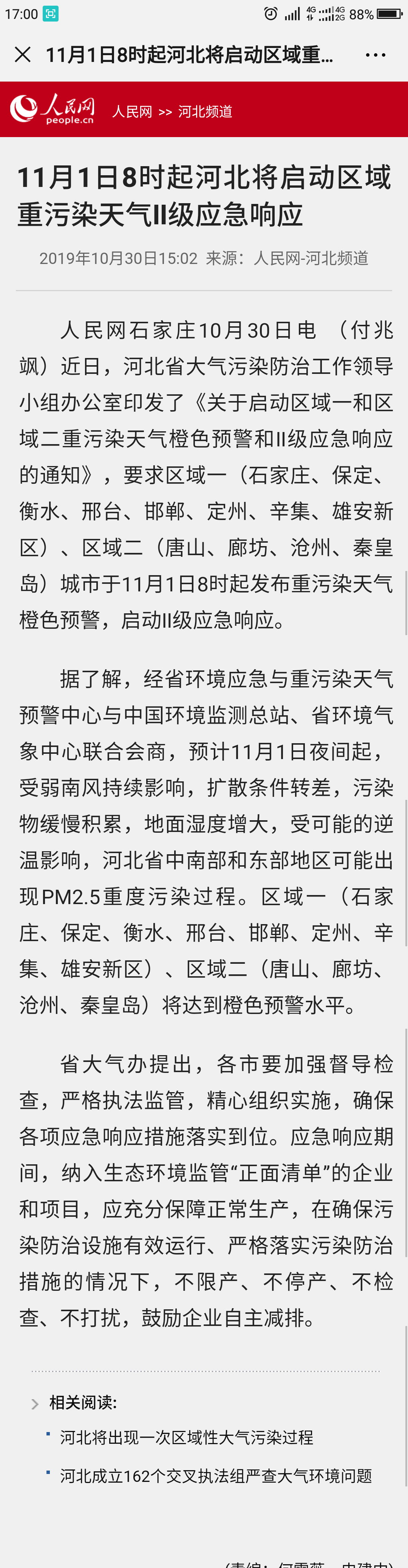 人民网:11月1日8时起河北将启动区域重污染天气Ⅱ级应急响应