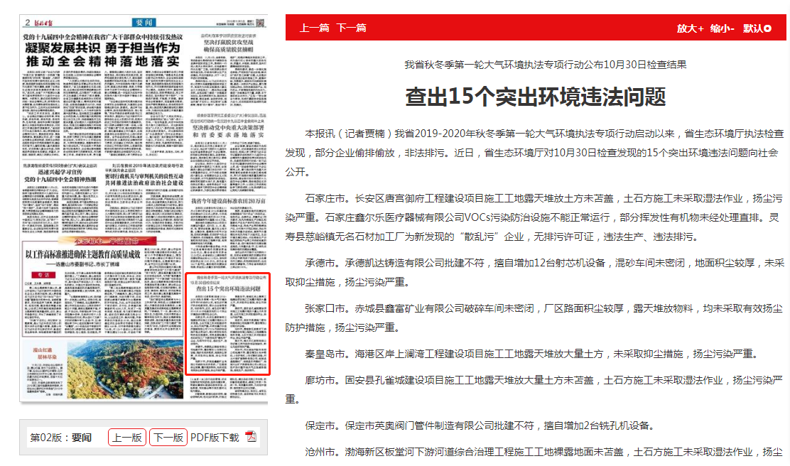 石家庄市。长安区唐宫御府工程建设项目施工工地露天堆放土方未苫盖,土石方施工未采取湿法作业,扬尘污染严重。石家庄鑫尔乐医疗器械有限公司VOCs污染防治设施不能正常运行,部分挥发性有机物未经处理直排。灵寿县慈峪镇无名石材加工厂为新发现的“散乱污”企业,无排污许可证,违法生产、违法排污。
