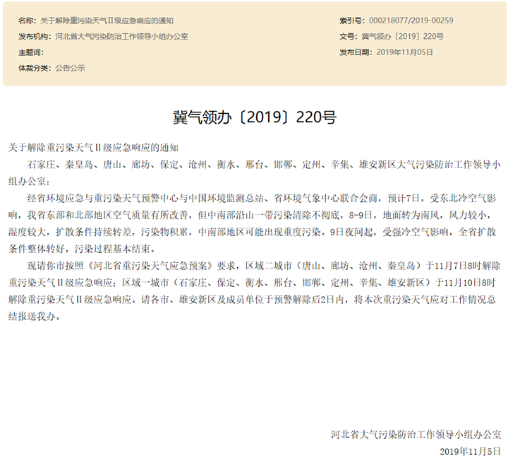 通知要求,区域二城市(唐山、廊坊、沧州、秦皇岛)于11月7日8时解除重污染天气Ⅱ级应急响应;区域一城市(石家庄、保定、衡水、邢台、邯郸、定州、辛集、雄安新区)于11月10日8时解除重污染天气Ⅱ级应急响应。