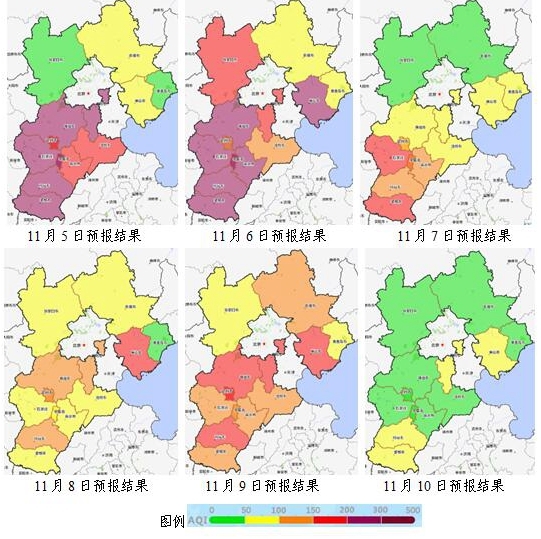 5~6日,河北省北部扩散条件一般,空气质量以良至轻度污染为主,中南部地面以偏南风为主,有逆温,扩散条件不利,空气质量以中至重度污染为主,首要污染物为PM2.5。