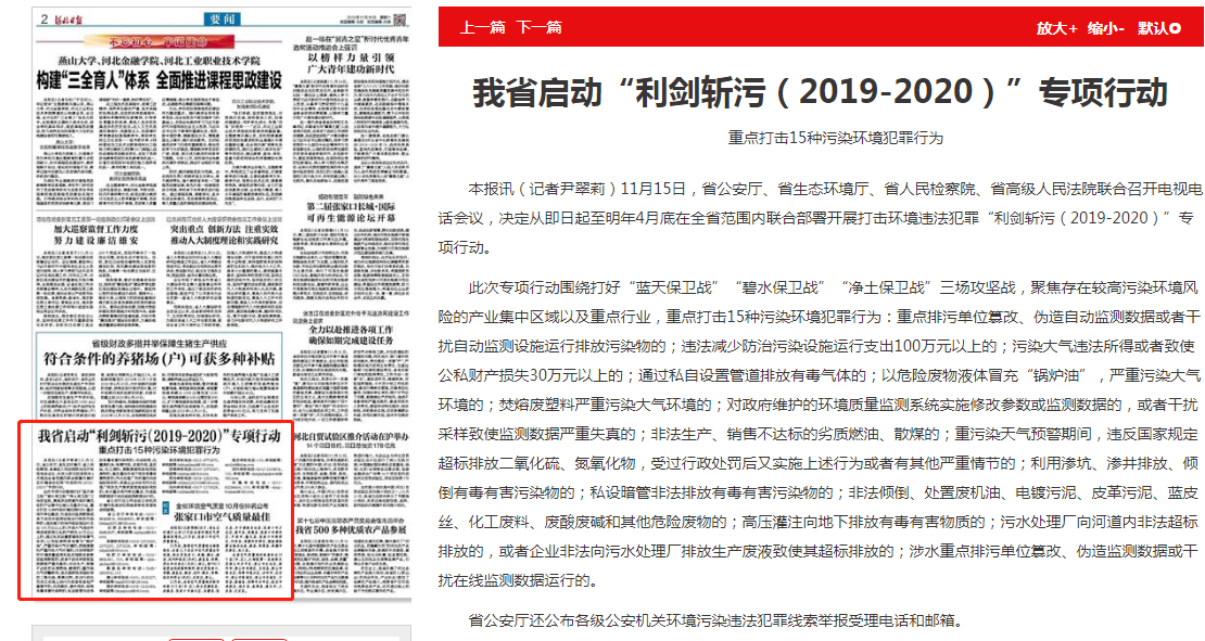 本报讯(记者尹翠莉)11月15日,省公安厅、成人视频 、省人民检察院、省高级人民法院联合召开电视电话会议,决定从即日起至明年4月底在全省范围内联合部署开展打击环境违法犯罪“利剑斩污(2019-2020)”专项行动。