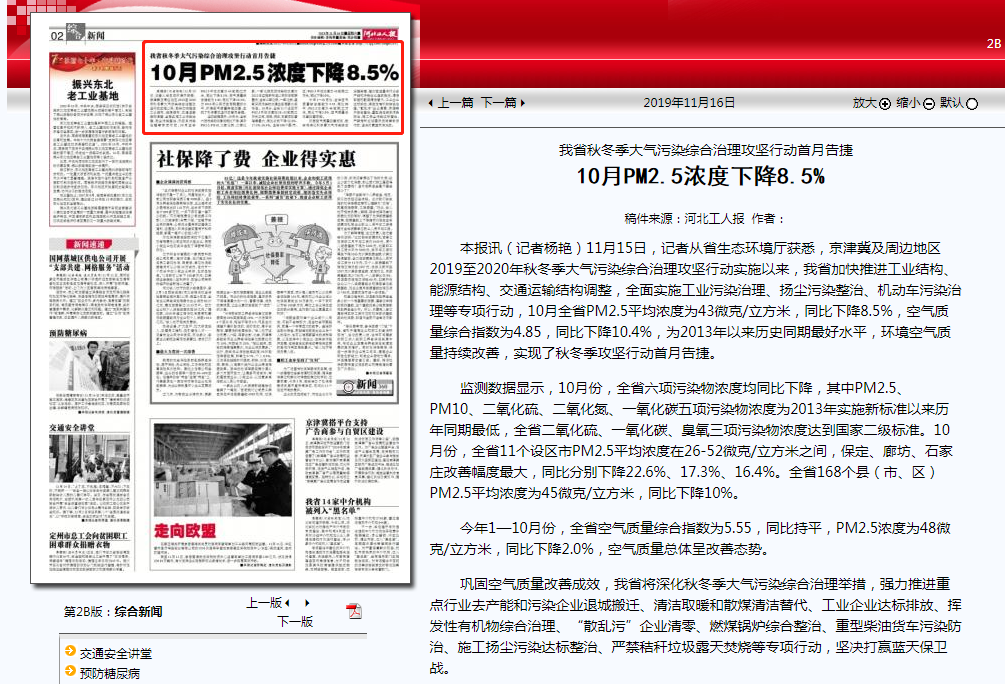 获悉,京津冀及周边地区2019至2020年秋冬季大气污染综合治理攻坚行动实施以来,我省加快推进工业结构、能源结构、交通运输结构调整,全面实施工业污染治理、扬尘污染整治、机动车污染治理等专项行动,10月全省PM2.5平均浓度为43微克/立方米,同比下降8.5%,空气质量综合指数为4.85,同比下降10.4%,为2013年以来历史同期最好水平,环境空气质量持续改善,实现了秋冬季攻坚行动首月告捷。