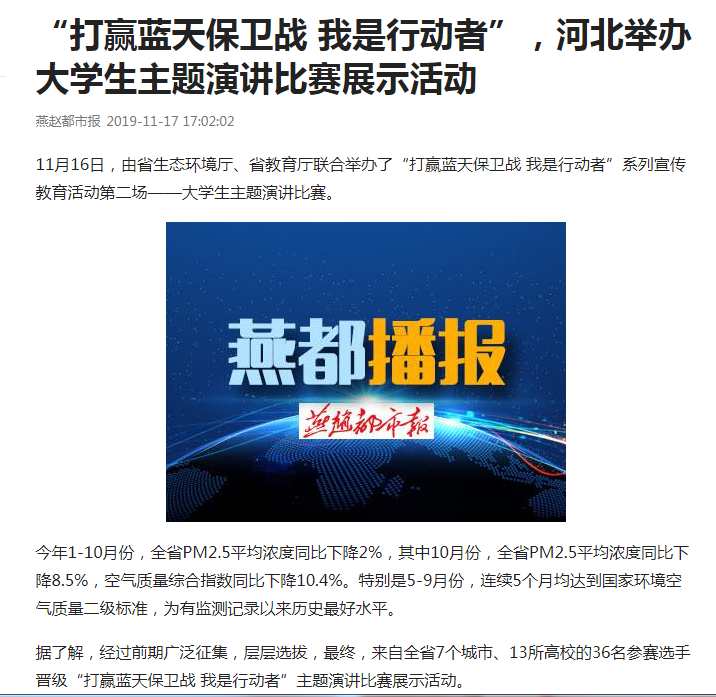 11月16日,由成人视频 、省教育厅联合举办了“打赢蓝天保卫战 我是行动者”系列宣传教育活动第二场——大学生主题演讲比赛。