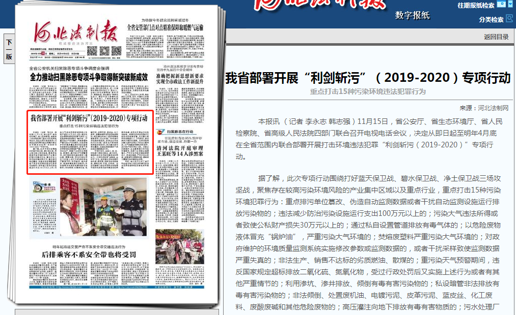 据了解,此次专项行动围绕打好蓝天保卫战、碧水保卫战、净土保卫战三场攻坚战,聚焦存在较高污染环境风险的产业集中区域以及重点行业,重点打击15种污染环境犯罪行为:重点排污单位篡改、伪造自动监测数据或者干扰自动监测设施运行排放污染物的;违法减少防治污染设施运行支出100万元以上的;污染大气违法所得或者致使公私财产损失30万元以上的;通过私自设置管道排放有毒气体的;以危险废物液体冒充“锅炉油”,严重污染大气环境的;焚熔废塑料严重污染大气环境的;对政府维护的环境质量监测系统实施修改参数或监测数据的,或者干扰采样致使监测数据严重失真的;非法生产、销售不达标的劣质燃油、散煤的;重污染天气预警期间,违反国家规定超标排放二氧化硫、氮氧化物,受过行政处罚后又实施上述行为或者有其他严重情节的;利用渗坑、渗井排放、倾倒有毒有害污染物的;私设暗管非法排放有毒有害污染物的;非法倾倒、处置废机油、电镀污泥、皮革污泥、蓝皮丝、化工废料、废酸废碱和其他危险废物的;高压灌注向地下排放有毒有害物质的;污水处理厂向河道内非法超标排放的,或者企业非法向污水处理厂排放生产废液致使其超标排放的;涉水重点排污单位篡改、伪造监测数据或干扰在线监测数据运行的。