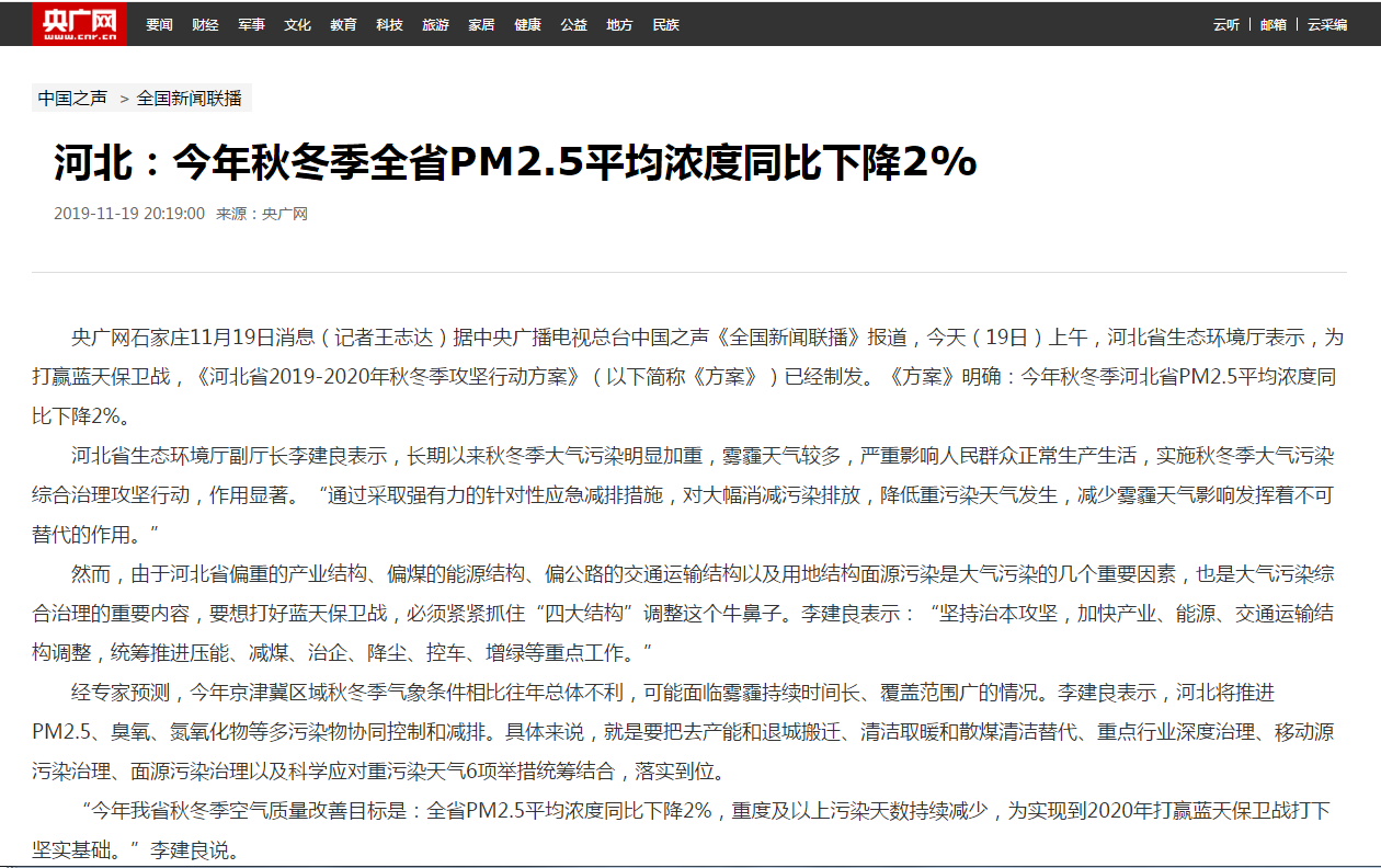 央广网石家庄11月19日消息(记者王志达)据中央广播电视总台中国之声《全国新闻联播》报道,今天(19日)上午,成人视频 表示,为打赢蓝天保卫战,《河北省2019-2020年秋冬季攻坚行动方案》(以下简称《方案》)已经制发。《方案》明确:今年秋冬季河北省PM2.5平均浓度同比下降2%。