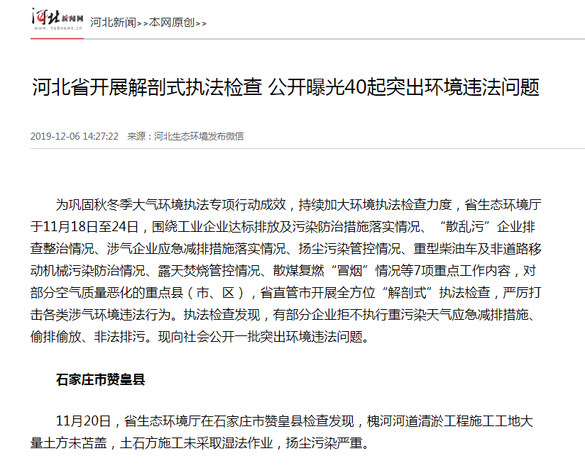 为巩固秋冬季大气环境执法专项行动成效,持续加大环境执法检查力度,成人视频 于11月18日至24日,围绕工业企业达标排放及污染防治措施落实情况、“散乱污”企业排查整治情况、涉气企业应急减排措施落实情况、扬尘污染管控情况、重型柴油车及非道路移动机械污染防治情况、露天焚烧管控情况、散煤复燃“冒烟”情况等7项重点工作内容,对部分空气质量恶化的重点县(市、区),省直管市开展全方位“解剖式”执法检查,严厉打击各类涉气环境违法行为。执法检查发现,有部分企业拒不执行重污染天气应急减排措施、偷排偷放、非法排污。现向社会公开一批突出环境违法问题。