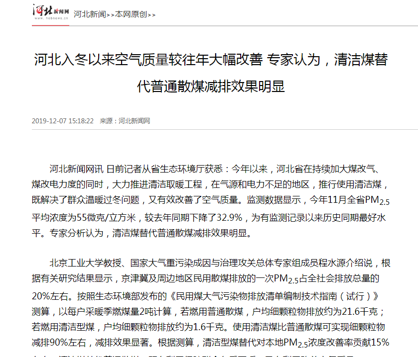 河北新闻网讯 日前记者从成人视频 获悉:今年以来,河北省在持续加大煤改气、煤改电力度的同时,大力推进清洁取暖工程,在气源和电力不足的地区,推行使用清洁煤,既解决了群众温暖过冬问题,又有效改善了空气质量。监测数据显示,今年11月全省PM2.5平均浓度为55微克/立方米,较去年同期下降了32.9%,为有监测记录以来历史同期最好水平。专家分析认为,清洁煤替代普通散煤减排效果明显。