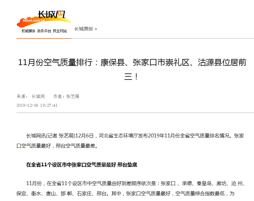 在全省11个设区市中张家口空气质量最好 邢台垫底