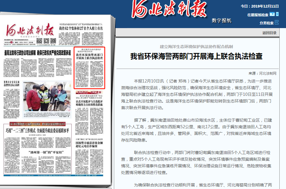 、河北海警局初步建立起了海洋生态环境保护执法协作配合机制,两部门于10日至11日开展海上联合执法检查行动。这是海洋生态环境保护职能划转到生态环境部门后,两部门首次联合开展执法行动。