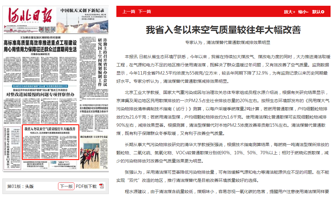 北京工业大学教授、国家大气重污染成因与治理攻关总体专家组成员程水源介绍说,根据有关研究结果显示,京津冀及周边地区民用散煤排放的一次PM2.5占全社会排放总量的20%左右。按照生态环境部发布的《民用煤大气污染物排放清单编制技术指南(试行)》测算,以每户采暖季燃煤量2吨计算,若燃用普通散煤,户均细颗粒物排放约为21.6千克;若燃用清洁型煤,户均细颗粒物排放约为1.6千克。使用清洁煤比普通散煤可实现细颗粒物减排90%左右,减排效果显著。根据测算,清洁型煤替代对本地PM2.5浓度改善率贡献15%左右。清洁煤替代普通散煤,既有利于保障群众冬季取暖,又有利于改善空气质量。