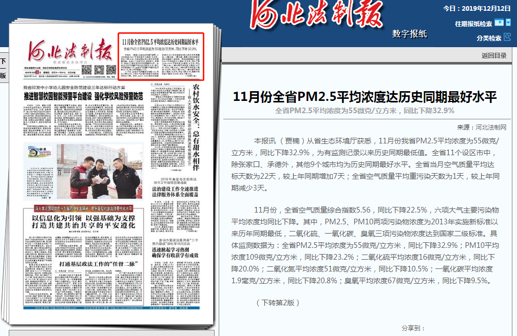 获悉,11月份我省PM2.5平均浓度为55微克/立方米,同比下降32.9%,为有监测记录以来历史同期最低值。全省11个设区市中,除张家口、承德外,其他9个城市均为历史同期最好水平。全省当月空气质量平均达标天数为22天,较上年同期增加7天;全省空气质量平均重污染天数为1天,较上年同期减少3天。