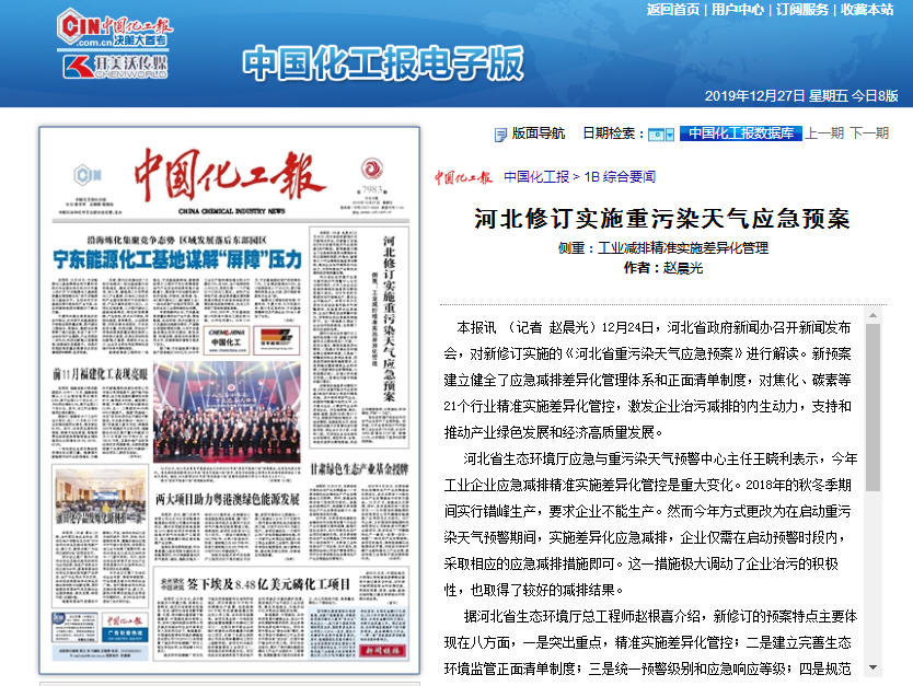 中化新网讯 (记者 赵晨光)12月24日,河北省政府新闻办召开新闻发布会,对新修订实施的《河北省重污染天气应急预案》进行解读。新预案建立健全了应急减排差异化管理体系和正面清单制度,对焦化、碳素等21个行业精准实施差异化管控,激发企业治污减排的内生动力,支持和推动产业绿色发展和经济高质量发展。