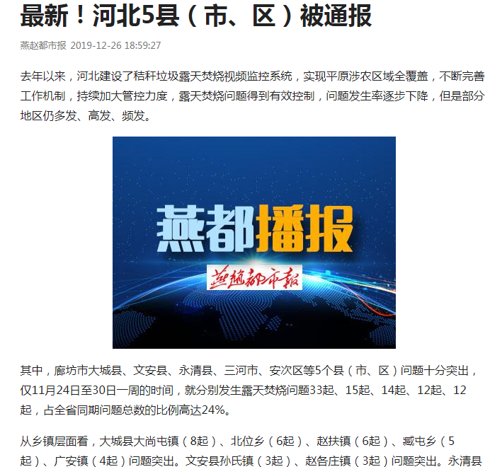 其中,廊坊市大城县、文安县、永清县、三河市、安次区等5个县(市、区)问题十分突出,仅11月24日至30日一周的时间,就分别发生露天焚烧问题33起、15起、14起、12起、12起,占全省同期问题总数的比例高达24%。