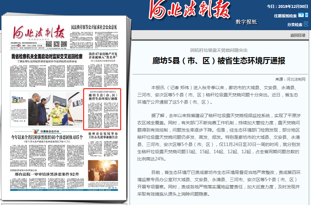 据了解,去年以来我省建设了秸秆垃圾露天焚烧视频监控系统,实现了平原涉农区域全覆盖。同时,有关部门不断完善工作机制,持续加大管控力度,露天焚烧问题得到有效控制,问题发生率逐步下降。但是,经生态环境部门检测发现,部分地区秸秆垃圾露天焚烧问题仍多发、高发、频发。特别是廊坊市的大城县、文安县、永清县、三河市、安次区等5个县(市、区),仅11月24日至30日一周的时间,就分别发生秸秆垃圾露天焚烧问题33起、15起、14起、12起、12起,占全省同期问题总数的比例高达24%。