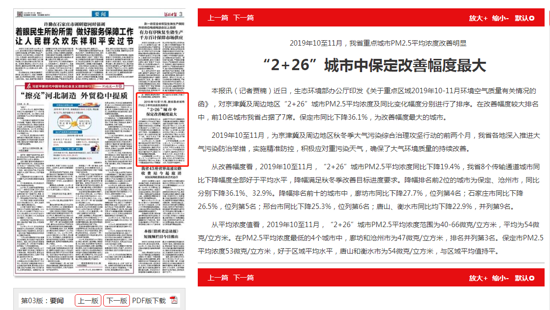 本报讯(记者贾楠)近日,生态环境部办公厅印发《关于重点区域2019年10-11月环境空气质量有关情况的函》,对京津冀及周边地区“2+26”城市PM2.5平均浓度及同比变化幅度分别进行了排序。在改善幅度较大排名中,前10名城市我省占据了7席。保定市同比下降36.1%,为改善幅度最大的城市。