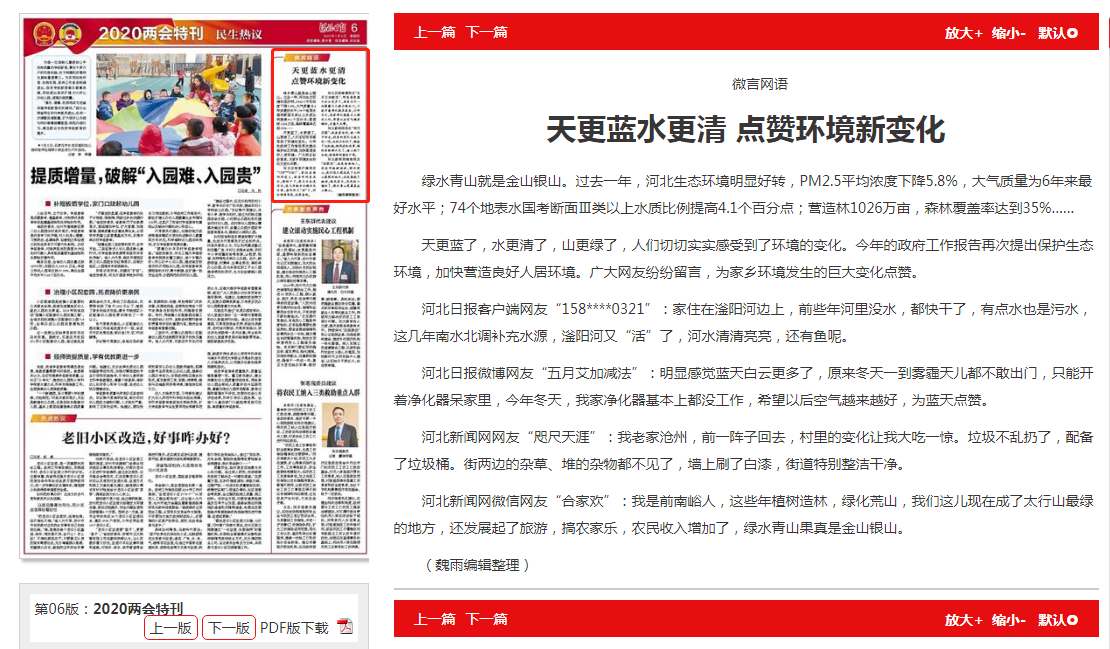 天更蓝了,水更清了,山更绿了,人们切切实实感受到了环境的变化。今年的政府工作报告再次提出保护生态环境,加快营造良好人居环境。广大网友纷纷留言,为家乡环境发生的巨大变化点赞。