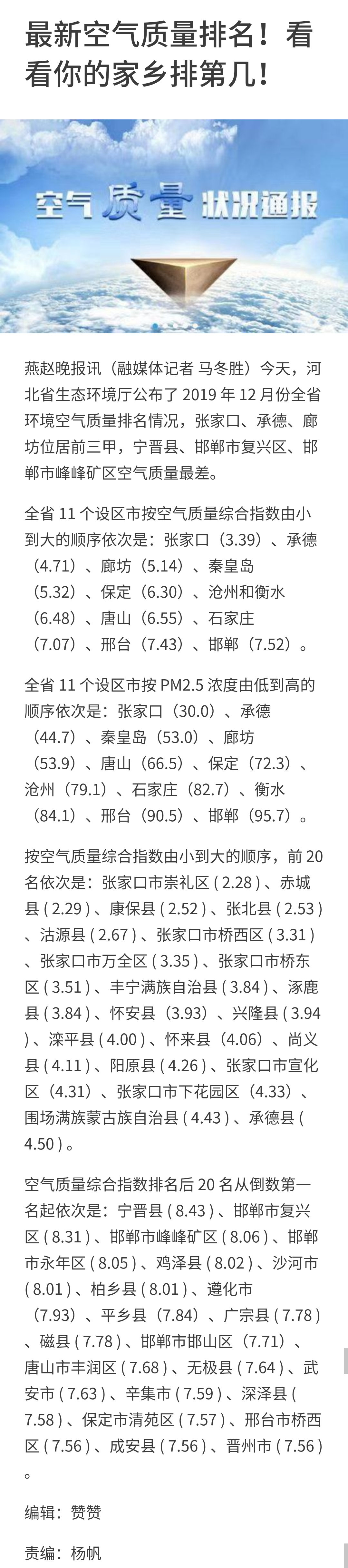 河北交通广播微博:成人视频 公布 2019 年 12 月份全省环境空气质量排名