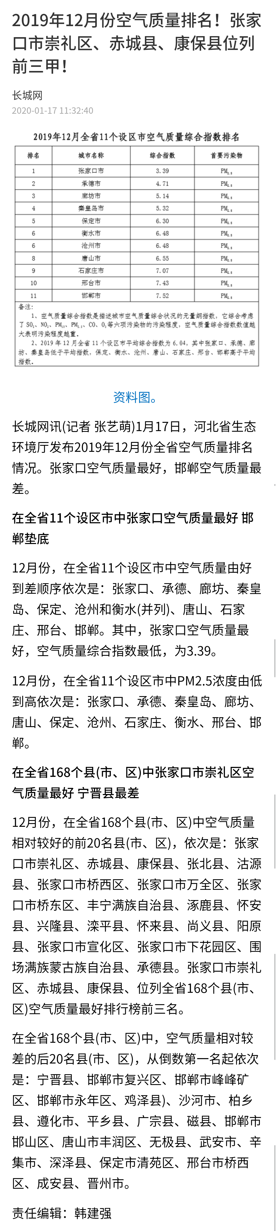 河北综合广播微信:2019年12月全省空气质量排名出炉,快看你家乡排名第几?