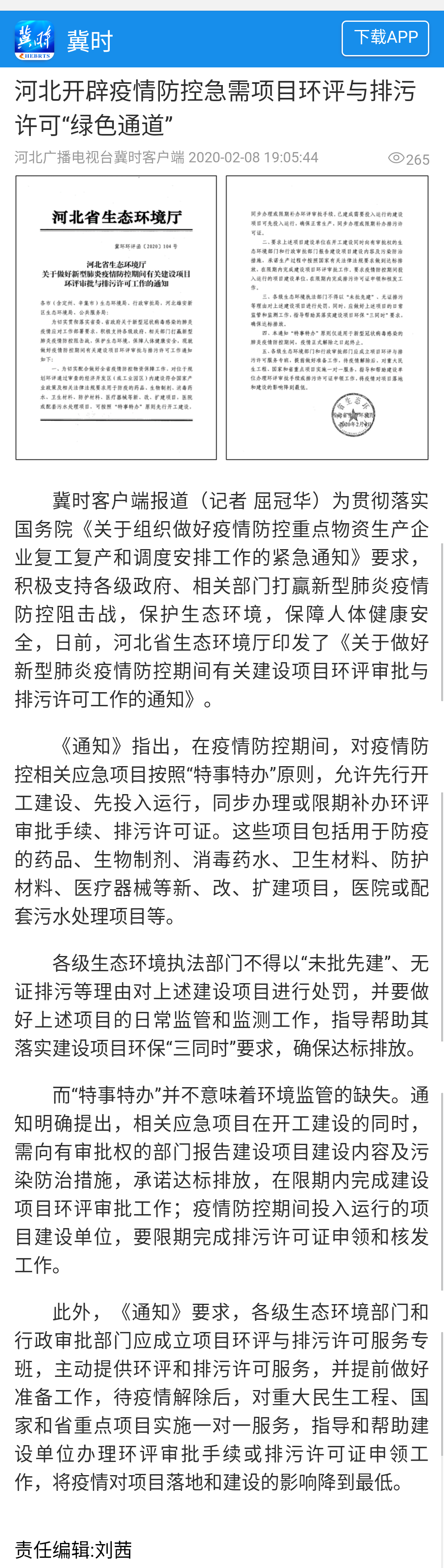 河北广播电视台冀时客户端:河北开辟疫情防控急需项目环评与排污许可“绿色通道”