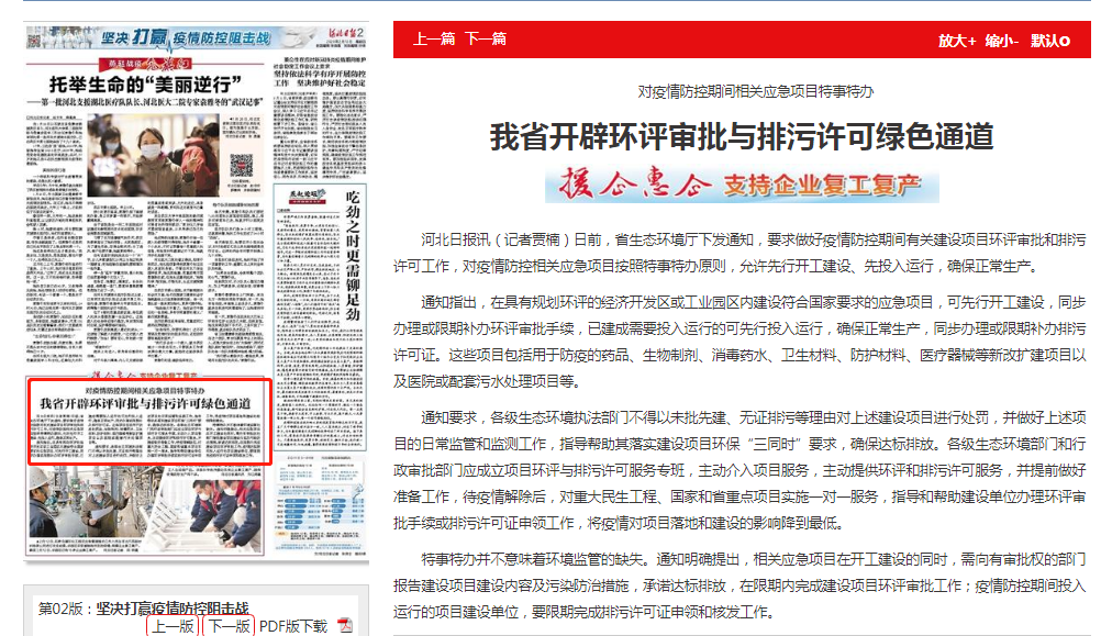 河北日报讯(记者贾楠)日前,成人视频 下发通知,要求做好疫情防控期间有关建设项目环评审批和排污许可工作,对疫情防控相关应急项目按照特事特办原则,允许先行开工建设、先投入运行,确保正常生产。