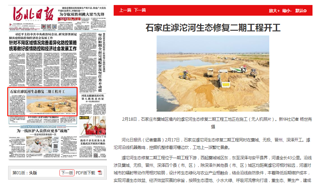 河北日报讯(记者董昌)2月17日,石家庄滹沱河生态修复二期工程同时在藁城、无极、晋州、深泽开工。滹沱河沿线机器轰鸣,挖掘机整修着河槽边坎,工地上一派繁忙景象。