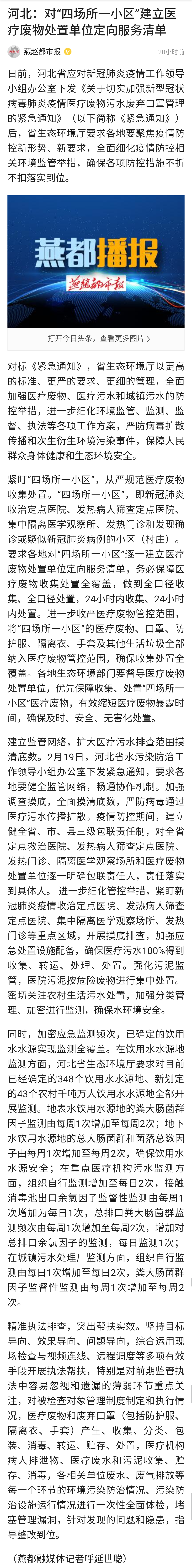 燕赵都市报:河北生态环境质量未受疫情影响 定点收治机构污染物全部达