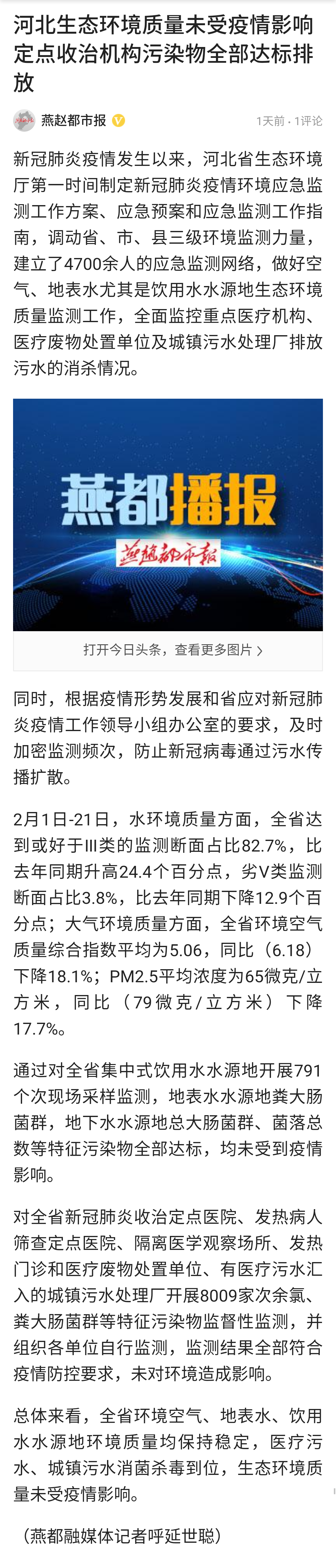 燕赵都市报:河北生态环境质量未受疫情影响 定点收治机构污染物全部达