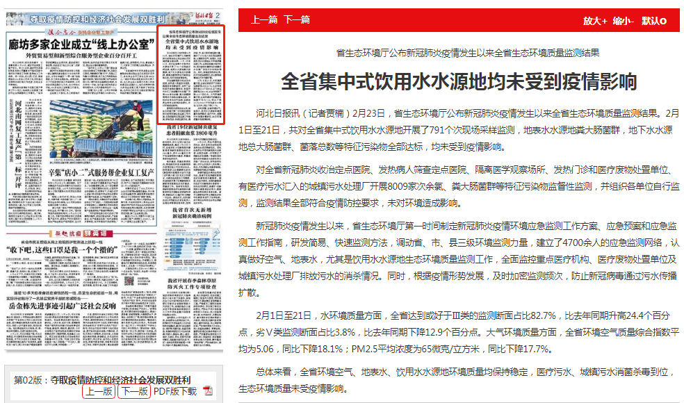 河北日报讯(记者贾楠)2月23日,成人视频 公布新冠肺炎疫情发生以来全省生态环境质量监测结果。2月1日至21日,共对全省集中式饮用水水源地开展了791个次现场采样监测,地表水水源地粪大肠菌群,地下水水源地总大肠菌群、菌落总数等特征污染物全部达标,均未受到疫情影响。