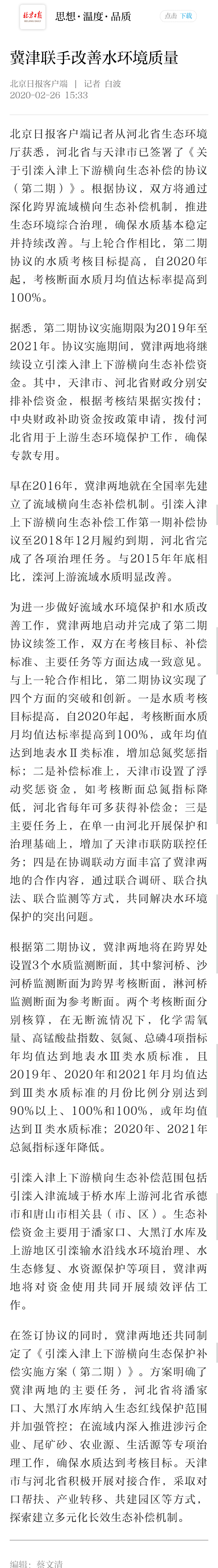 北京日报客户端:冀津联手改善水环境质量