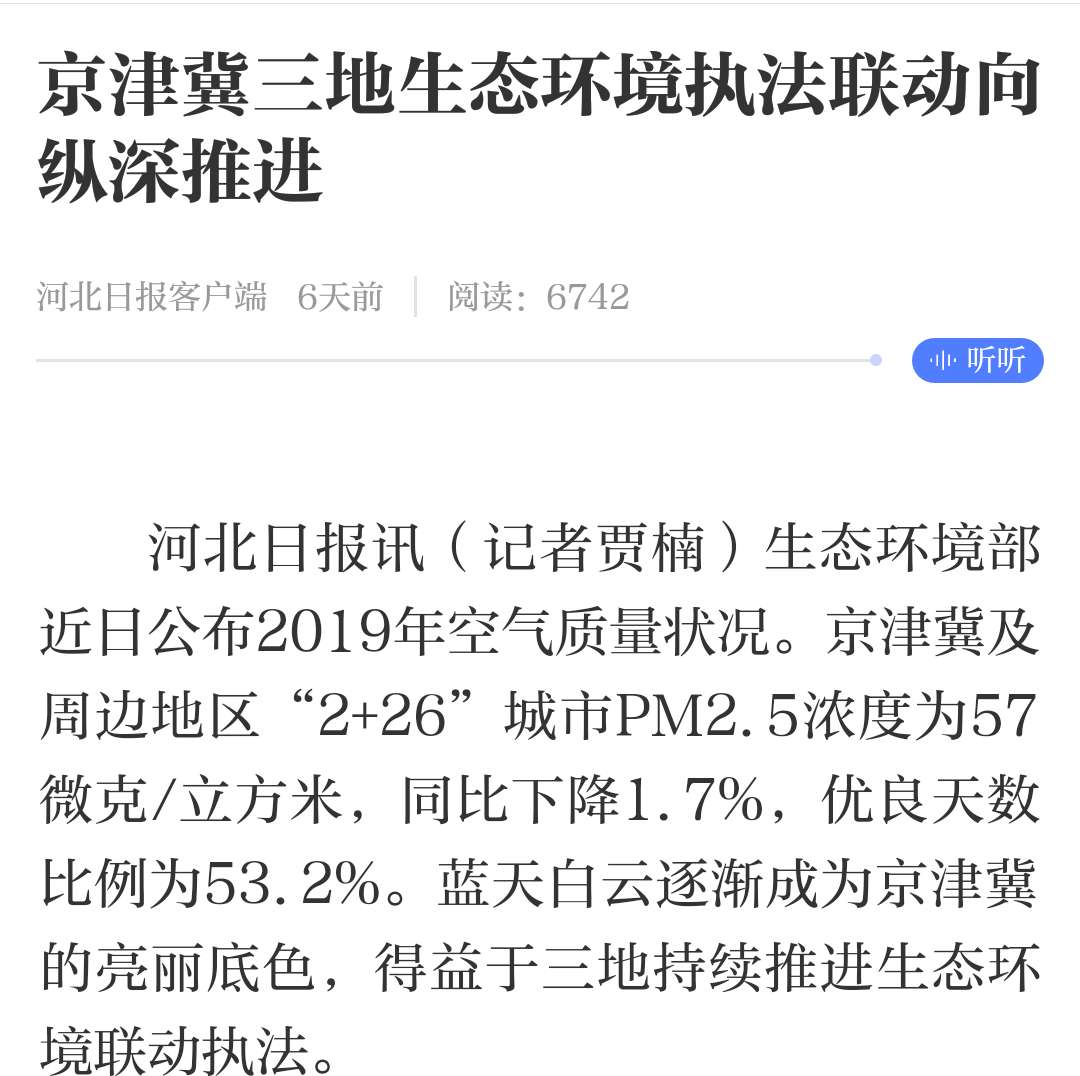 河北日报讯(记者贾楠)生态环境部近日公布2019年空气质量状况。京津冀及周边地区“2+26”城市PM2.5浓度为57微克/立方米,同比下降1.7%,优良天数比例为53.2%。蓝天白云逐渐成为京津冀的亮丽底色,得益于三地持续推进生态环境联动执法。
