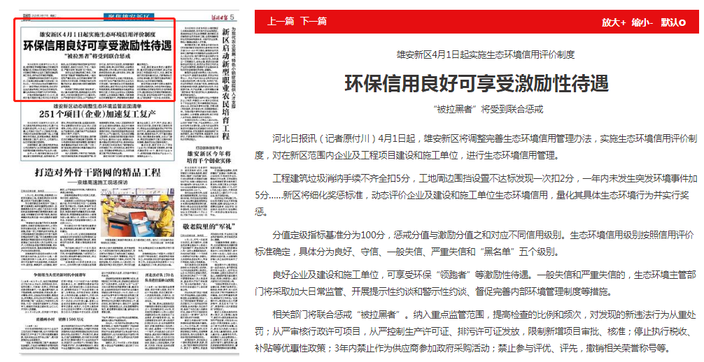 河北日报讯(记者原付川)4月1日起,雄安新区将调整完善生态环境信用管理办法,实施生态环境信用评价制度,对在新区范围内企业及工程项目建设和施工单位,进行生态环境信用管理。