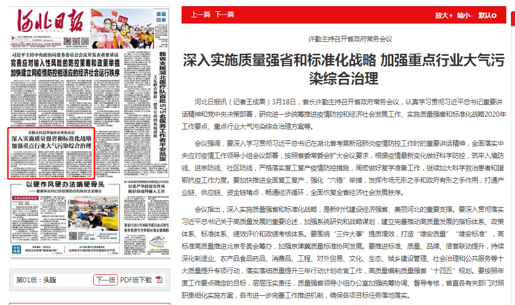 河北日报讯(记者王成果)3月18日,省长许勤主持召开省政府常务会议,认真学习贯彻习近平总书记重要讲话精神和党中央决策部署,研究进一步统筹推进疫情防控和经济社会发展工作、实施质量强省和标准化战略2020年工作要点、重点行业大气污染综合治理方案等。