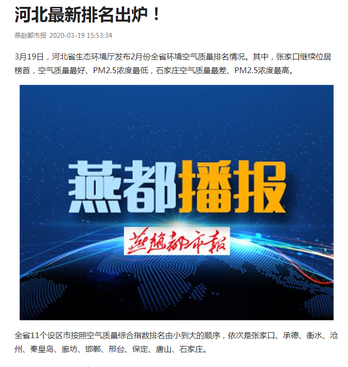 3月19日,成人视频 发布2月份全省环境空气质量排名情况。其中,张家口继续位居榜首,空气质量最好、PM2.5浓度最低,石家庄空气质量最差、PM2.5浓度最高。
