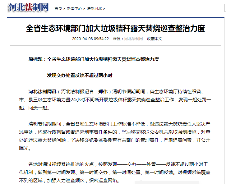 河北法制网 :全省生态环境部门加大垃圾秸秆露天焚烧巡查整治力度
