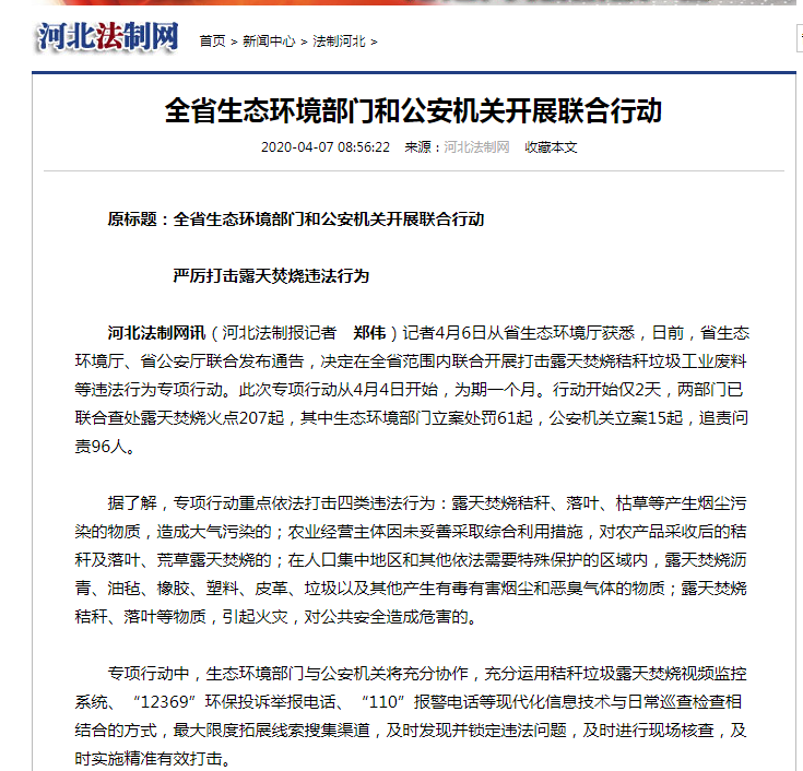 河北法制网 :全省生态环境部门加大垃圾秸秆露天焚烧巡查整治力度