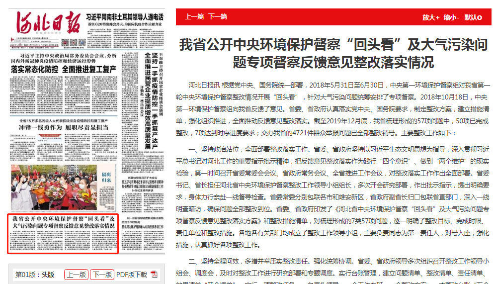 河北日报讯 根据党中央、国务院统一部署,2018年5月31日至6月30日,中央第一环境保护督察组对我省第一轮中央环境保护督察整改情况开展“回头看”,针对大气污染问题统筹安排了专项督察。2018年10月18日,中央第一环境保护督察组向我省反馈了意见。省委、省政府认真落实党中央、国务院要求,制定整改方案,建立措施清单,强化组织推进,全面推动反馈意见整改落实。截至2019年12月底,我省梳理形成的57项问题中,50项已完成整改,7项达到时序进度要求;交办我省的4721件群众举报问题已全部整改销号。主要整改工作如下: