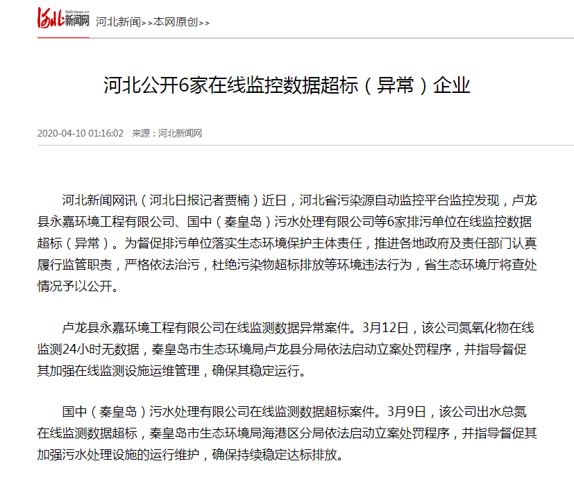 国中(秦皇岛)污水处理有限公司在线监测数据超标案件。3月9日,该公司出水总氮在线监测数据超标,秦皇岛市生态环境局海港区分局依法启动立案处罚程序,并指导督促其加强污水处理设施的运行维护,确保持续稳定达标排放。