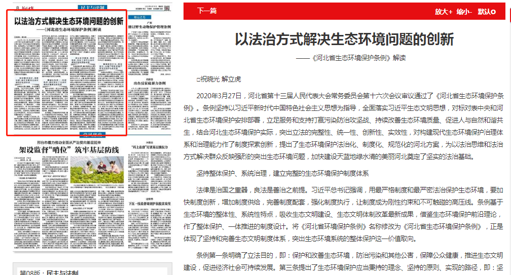 维护法制统一是立法的基本要求,增强操作性是高质量立法的重要特征。条例坚持上下衔接、横向兼顾,既与上位法的规定相一致,又与河北有关地方性法规相衔接,保障制度的系统性、整体性和协同性。在对接现行法律、行政法规重要生态环境保护法律制度时,不照搬照抄,在体现制度内涵的基础上,细化具体制度规定,建立适合河北生态环境保护实践及需求的规范体系,力求可操作、能实施、真落地。