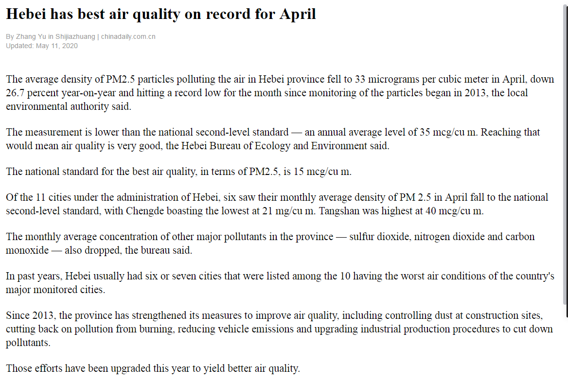 The measurement is lower than the national second-level standard — an annual average level of 35 mcg/cu m. Reaching that would mean air quality is very good, the Hebei Bureau of Ecology and Environment said.
