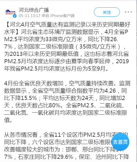 河北综合广播微博:河北4月空气质量达有监测记录以来历史同期最好水平