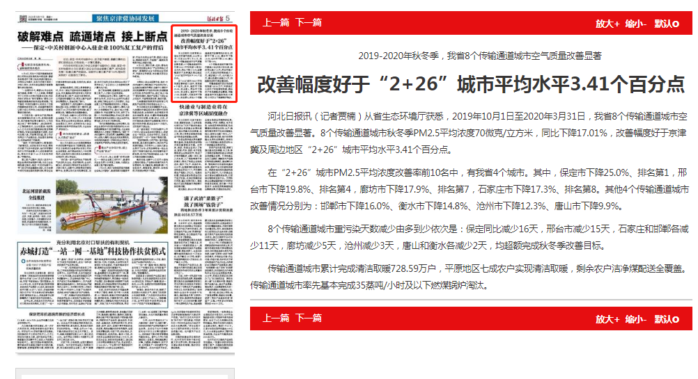 在“2+26”城市PM2.5平均浓度改善率前10名中,有我省4个城市。其中,保定市下降25.0%、排名第1,邢台市下降19.8%、排名第4,廊坊市下降17.9%、排名第7,石家庄市下降17.3%、排名第8。其他4个传输通道城市改善情况分别为:邯郸市下降16.0%、衡水市下降14.8%、沧州市下降12.3%、唐山市下降9.9%。