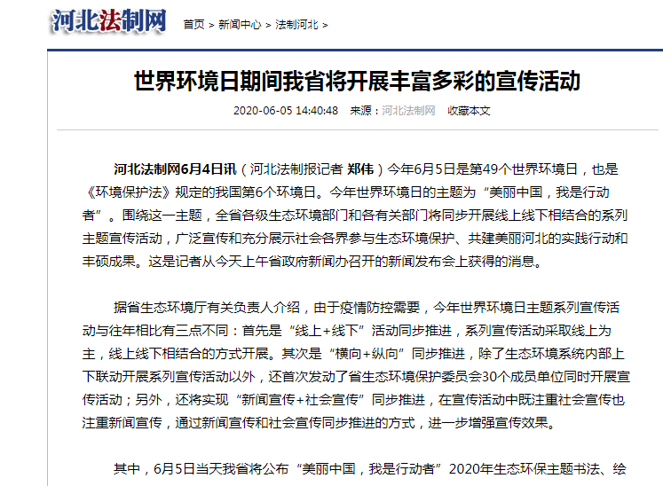 其中,6月5日当天我省将公布“美丽中国,我是行动者”2020年生态环保主题书法、绘画、摄影大赛获奖作品并展播;正式启动2020年度“美丽河北·最美蓝天卫士”评选活动,同时启动“寻找全国最美基层环保人”活动,营造全省上下合力攻坚、积极参与、全民共治的良好氛围;向全社会发布“同心协力建设美丽河北 坚决打赢污染防治攻坚战 ”主题倡议书,号召大家从各自领域践行“我是行动者”的使命。