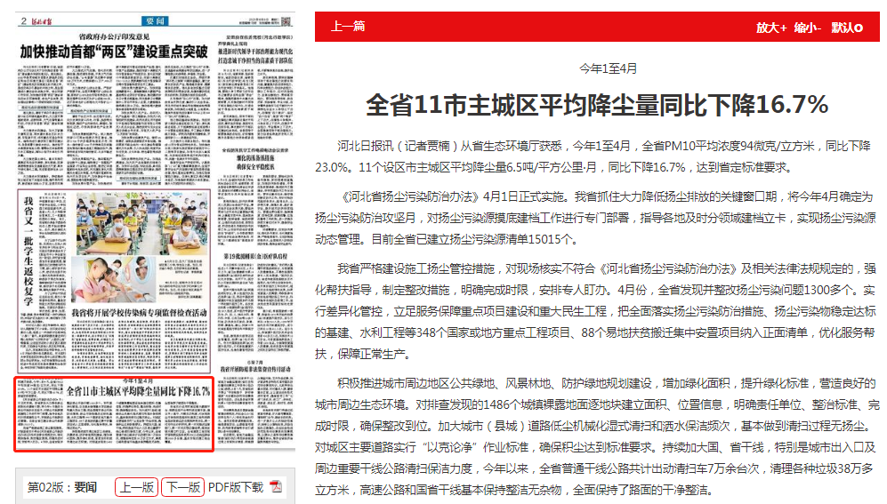 我省严格建设施工扬尘管控措施,对现场核实不符合《河北省扬尘污染防治办法》及相关法律法规规定的,强化帮扶指导,制定整改措施,明确完成时限,安排专人盯办。4月份,全省发现并整改扬尘污染问题1300多个。实行差异化管控,立足服务保障重点项目建设和重大民生工程,把全面落实扬尘污染防治措施、扬尘污染物稳定达标的基建、水利工程等348个国家或地方重点工程项目、88个易地扶贫搬迁集中安置项目纳入正面清单,优化服务帮扶,保障正常生产。