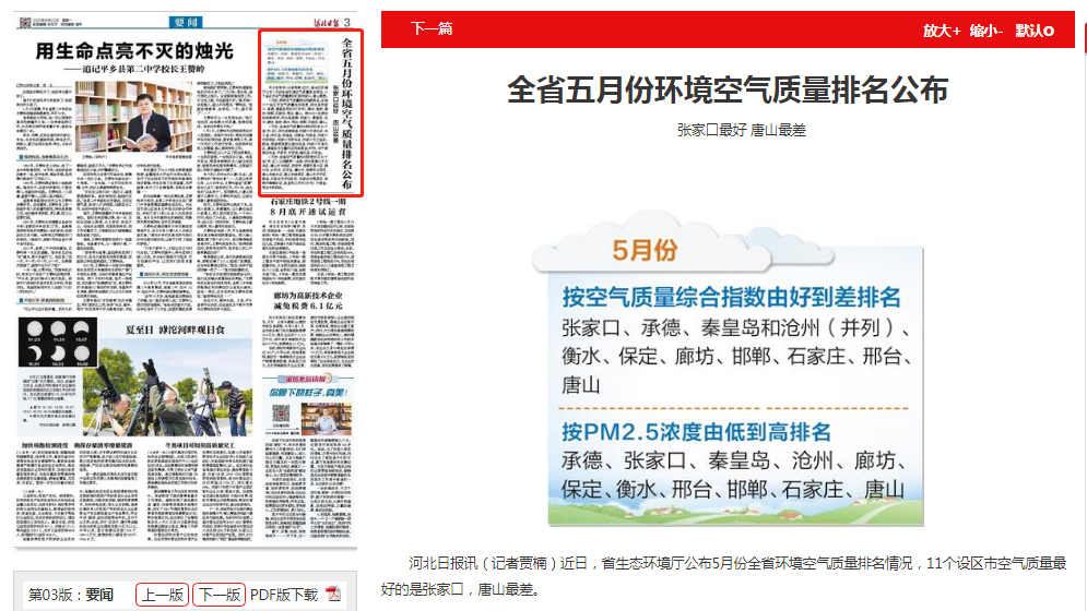 5月份,按照空气质量综合指数排名,全省11个设区市空气质量由好到差,依次是张家口、承德、秦皇岛和沧州(并列)、衡水、保定、廊坊、邯郸、石家庄、邢台、唐山。按PM2.5浓度由低到高顺序,依次是承德、张家口、秦皇岛、沧州、廊坊、保定、衡水、邢台、邯郸、石家庄、唐山。