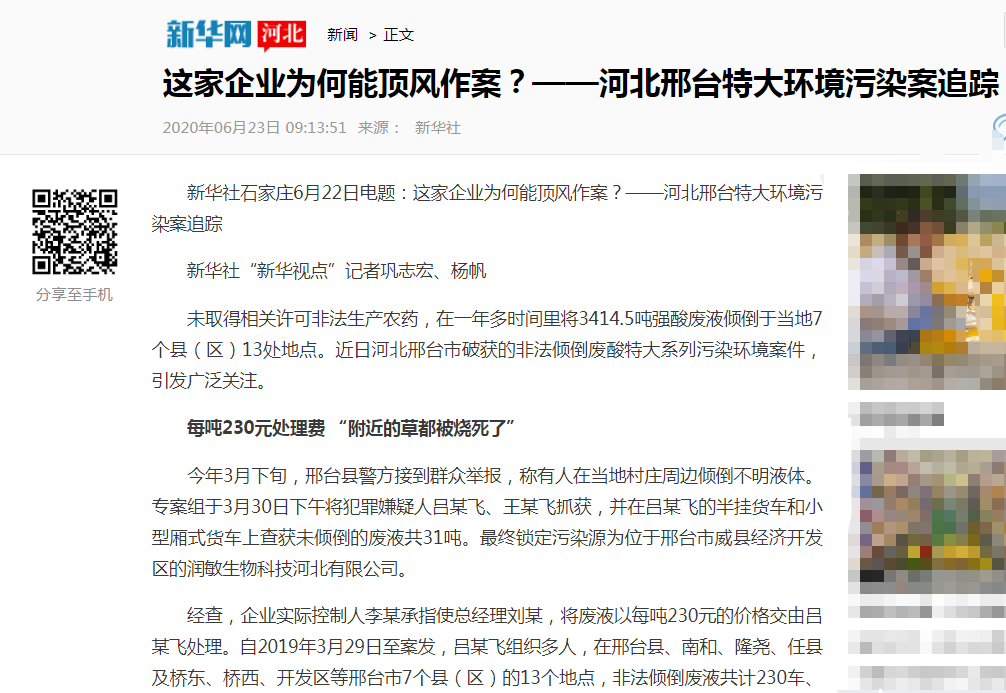 今年3月下旬,邢台县警方接到群众举报,称有人在当地村庄周边倾倒不明液体。专案组于3月30日下午将犯罪嫌疑人吕某飞、王某飞抓获,并在吕某飞的半挂货车和小型厢式货车上查获未倾倒的废液共31吨。最终锁定污染源为位于邢台市威县经济开发区的润敏生物科技河北有限公司。